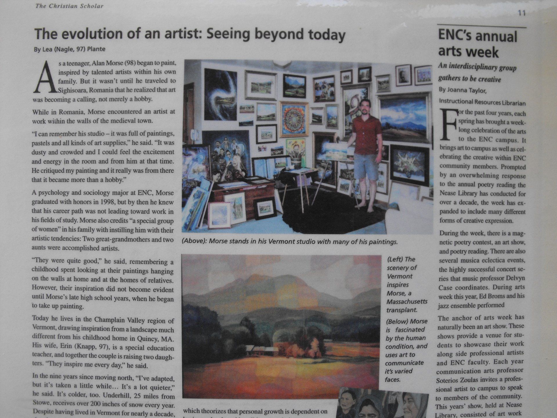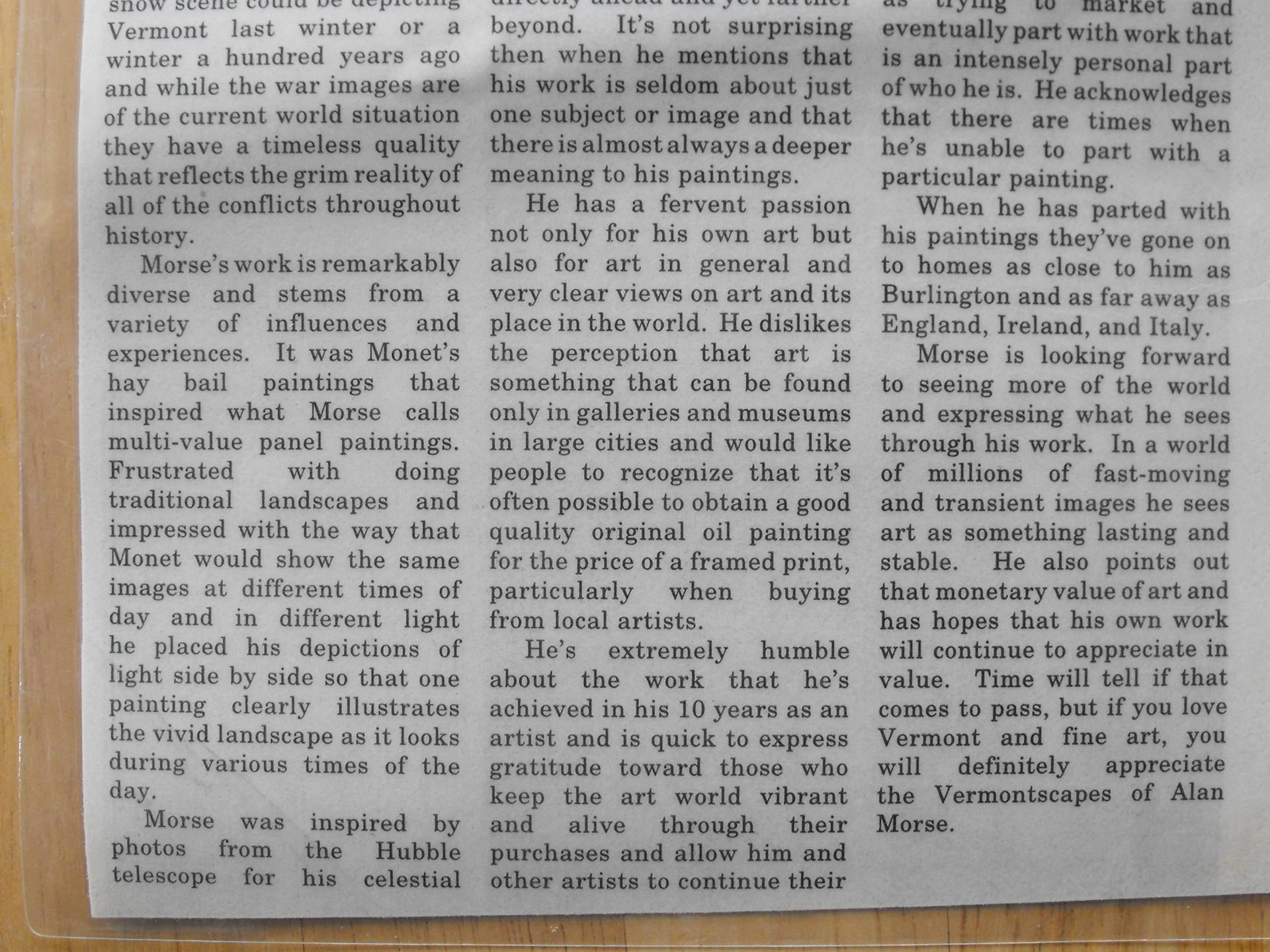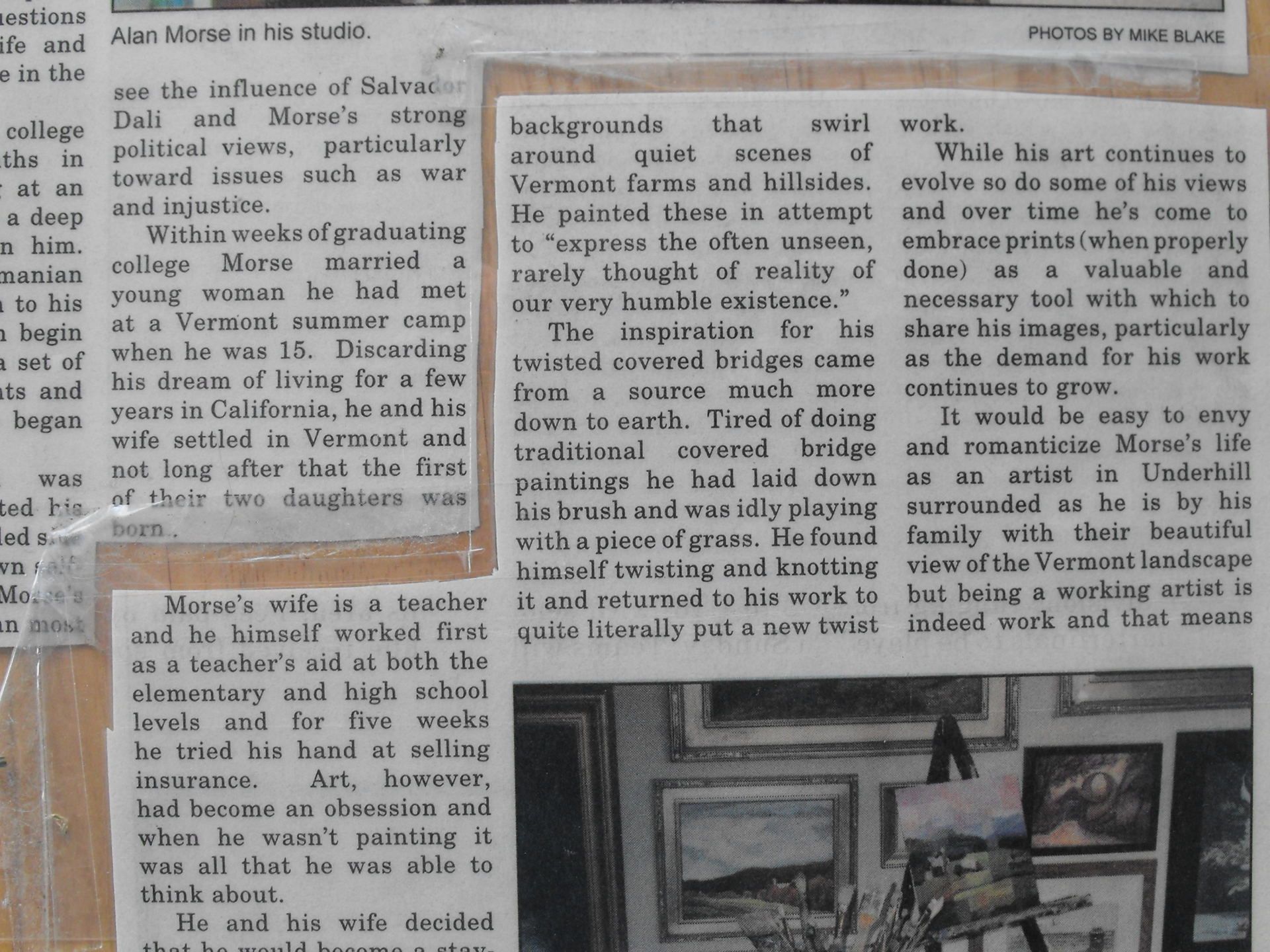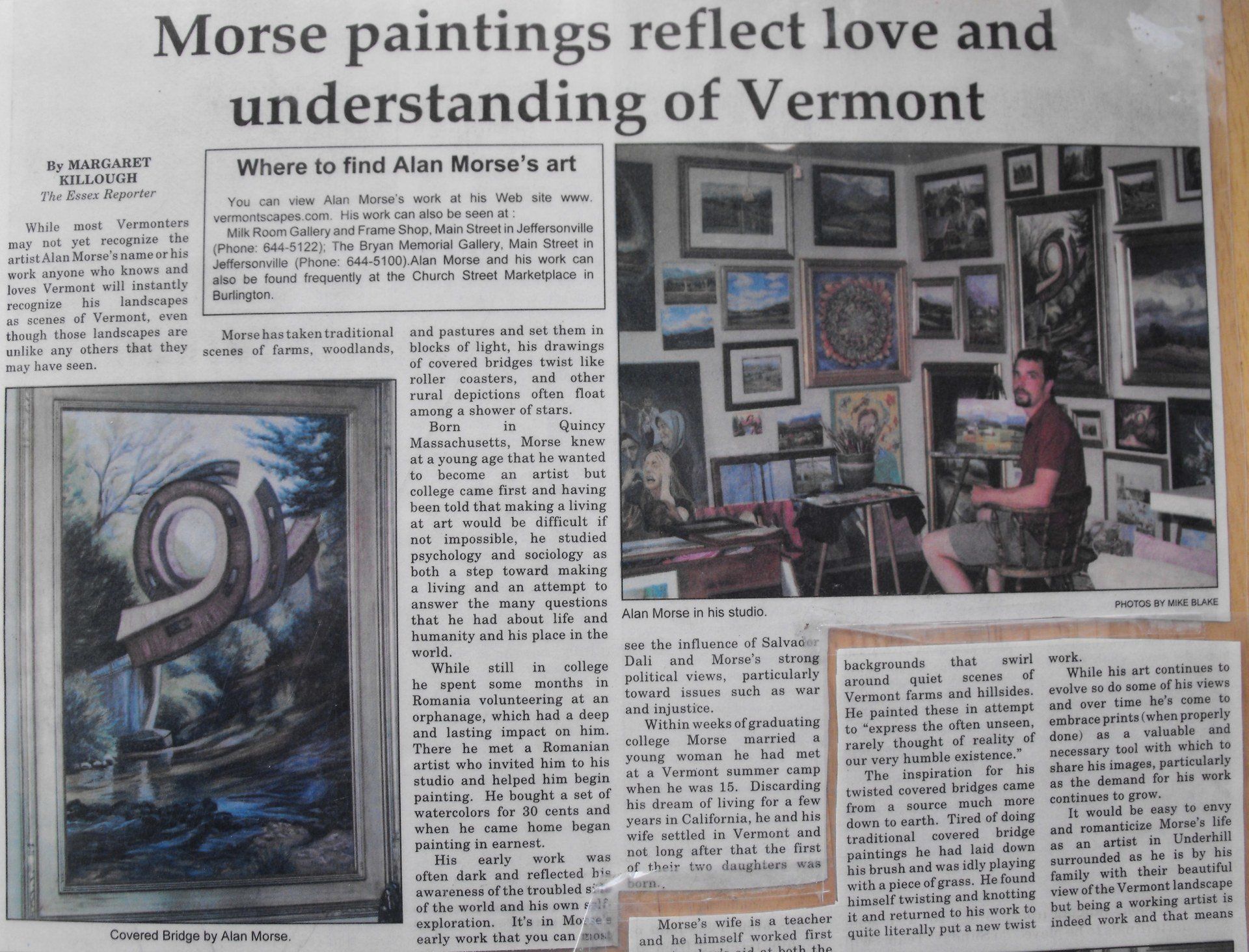 W. Alan Morse is an artist painting in Vermont where his family and he reside. He paints a variety of subjects, with landscapes currently being his main focus. Alan uses a multitude of methods and media to communicate his creative needs and to express his vision. "Art has been a journey for me with plenty of twists and turns along the way, and there’s still no end in sight." Painting is a tool for him to explore his inner and outer world, and to share that with others,  "I enjoy providing individuals, families, and businesses with artwork that lives on the walls and becomes part of their everyday lives. This is what drives me forward, to live and love with vibrancy and color."  New artwork will be added to this site periodically, and will be available for sale soon, "Spread some kindness, delight in the hour, and embrace the day."